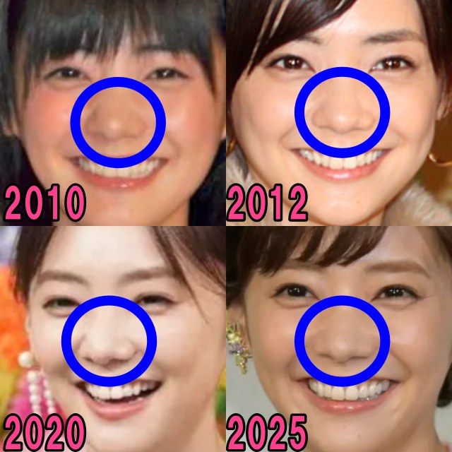 照明の影響や撮影アングルの違いはありますが、鼻筋や小鼻の大きさなどに変化は無く、整形施術が行われたという形跡もありませんでした。